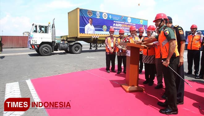 TIMES Temanggung/Gubernur Jawa Timur. Dra. Hj. Khofifah Indar Parawansa saat melepas ekspor komoditi pertanian di Terminal PetikEmas Surabaya (TPS). Kamis (21/3/2019). (FOTO: TIM Media For TIMES Indonesia)