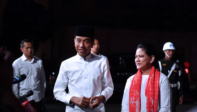 TIMES Temanggung/Capres nomor urut 01 Joko Widodo bersama istri Iriana Joko Widodo tiba di lokasi untuk mengikuti debat Pilpres 2019 putaran kelima, di Hotel Sultan, Jakarta, Sabtu (13/4/2019). (FOTO: Rivan Awal Lingga/Antarafoto)